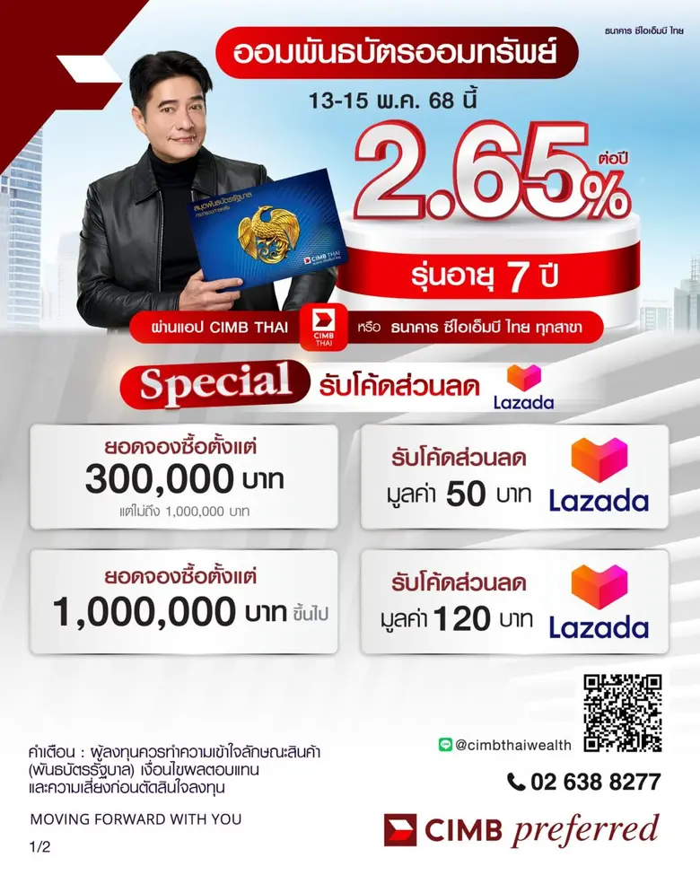 พันธบัตรออมทรัพย์ รุ่นอายุ 7 ปี ที่จำหน่ายผ่านธนาคาร ซีไอเอ็มบี ไทย อัตราดอกเบี้ย 2.65% ต่อปี ซึ่งสูงกว่าบัญชีเงินฝากทั่วไป เหมาะสำหรับผู้ที่ต้องการสร้างรายได้อย่างมั่นคงในระยะยาว ทั้งยังมีความมั่นคงเพราะเป็นตราสารหนี้ที่ออกโดยกระทรวงการคลัง และได้รับความนิยมสูงในกลุ่มผู้รักความปลอดภัยในการลงทุน