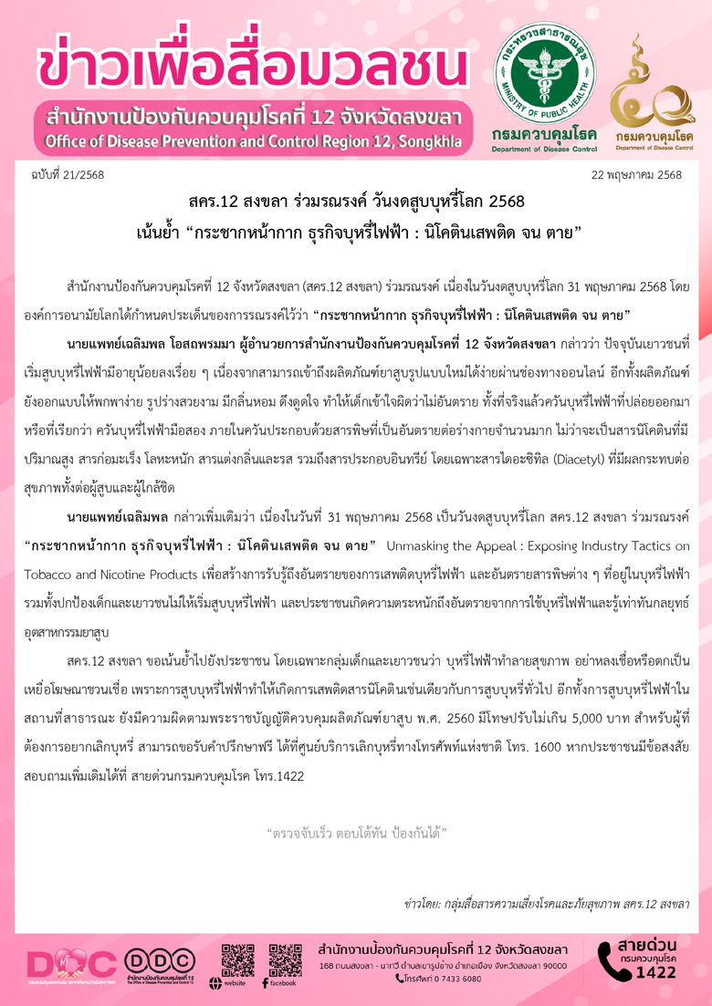 นายแพทย์เฉลิมพล กล่าวเพิ่มเติมว่า เนื่องในวันที่ 31 พฤษภาคม 2568 เป็นวันงดสูบบุหรี่โลก สคร.12 สงขลา ร่วมรณรงค์ "กระชากหน้ากาก ธุรกิจบุหรี่ไฟฟ้า : นิโคตินเสพติด จน ตาย" Unmasking the Appeal : Exposing Industry Tactics on Tobacco and Nicotine Products เพื่อสร้างการรับรู้ถึงอันตรายของการเสพติดบุหรี่ไฟฟ้า และอันตรายสารพิษต่าง ๆ ที่อยู่ในบุหรี่ไฟฟ้า รวมทั้งปกป้องเด็กและเยาวชนไม่ให้เริ่มสูบบุหรี่ไฟฟ้า และประชาชนเกิดความตระหนักถึงอันตรายจากการใช้บุหรี่ไฟฟ้าและรู้เท่าทันกลยุทธ์อุตสาหกรรมยาสูบ