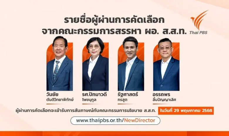 ทั้งนี้ คณะกรรมการสรรหาฯ ได้พิจารณาผู้ที่มีความเหมาะสมเพื่อเสนอชื่อเข้าดำรงตำแหน่งผู้อำนวยการ ส.ส.ท. ต่อคณะกรรมการนโยบาย ส.ส.ท. โดยใช้หลักเกณฑ์ที่กำหนดไว้ตามเอกสารแนบท้ายประกาศคณะกรรมการสรรหาฯ ฉบับที่ 4/2568 ซึ่งได้แก่ ประวัติ ผลงาน ความรู้ ความสามารถซึ่งเหมาะสมในการเข้าดำรงตำแหน่งผู้อำนวยการ ส.ส.ท. ภาวะผู้นำและความสามารถในการบริหาร วิสัยทัศน์และแนวคิดเชิงกลยุทธ์ และการนำวิสัยทัศน์ไปสู่การปฏิบัติ ผู้สมัครที่ได้รับคะแนนเสียงรับรองไม่น้อยกว่ากึ่งหนึ่งของจำนวนกรรมการสรรหาฯ ทั้งหมด จึงจะถือว่าเป็นผู้ผ่านการพิจารณา