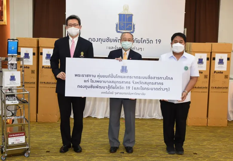 ศาสตราจารย์ ดร.สุพจน์ เตชวรสินสกุล (ซ้าย) คณบดี คณะวิศวกรรมศาสตร์ จุฬาลงกรณ์มหาวิทยาลัย ร่วมกับกลุ่มสตาร์ทอัพศิษย์เก่าจุฬาลงกรณ์มหาวิทยาลัยนำ "หุ่นยนต์ปิ่นโต และ "กระจกระบบสื่อสารทางไกล" มอบแก่ดร.สุเมธ ตันติเวชกุล (กลาง) กรรมการและเลขาธิการมูลนิธิชัยพัฒนา เพื่อร่วมในโครงการกองทุนชัยพัฒนาสู้ภัยโควิด-19 (และโรคระบาดต่างๆ) โครงการในสมเด็จพระกนิษฐา ธิราชเจ้า กรมสมเด็จพระเทพรัตนราชสุดาฯ สยามบรมราชกุมารี เพื่อส่งมอบต่อให้แก่โรงพยาบาลสมุทรสาคร จำนวน 10 ชุด โดยมี นายแพทย์ธนพัฒน์ พวงเพชร (ขวา) รองผู้อำนวยการด้านพัฒนาระบบบริการสุขภาพ โรงพยาบาลสมุทรสาคร เป็นผู้แทนรับมอบ เพื่อรับมือวิกฤตการณ์การแพร่ระบาดของไวรัสโควิด-19 ระลอกใหม่ในประเทศไทย เพื่อป้องกันบุคลากรทางการแพทย์และดูแลผู้ป่วยโควิด-19 โดยเฉพาะในจังหวัดสมุทรสาคร ซึ่งมีแรงงานต่างชาติและคนไทยได้รับเชื้อและเข้ารับการรักษาตัวในโรงพยาบาล เป็นจำนวนมาก